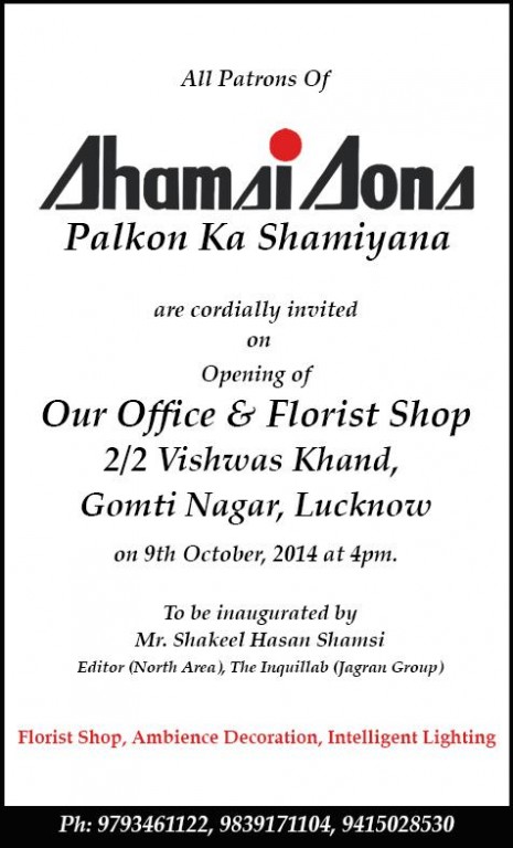 Shamsi Sons in Gomti Nagar offers its customers a wide range of services. The beautiful flowers are hand-delivered by their uniformed representatives. It is also into floral décor for offices, home décor for various festive occasions, wedding décor, floral décor for corporate events and other such event related décor activities.